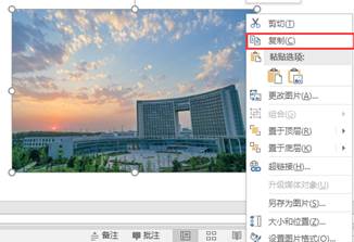 6、切换至原幻灯片,选择风景图片,鼠标右击选择“复制”,然后,选择刚刚组合的。