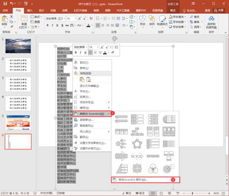 1、打开PPT,鼠标选中pp电子游戏平台网站组织机构中的所有文字,在所选文字上方进行鼠标右击,选择“转换为SmartArt—其他SmartArt图形”选项。