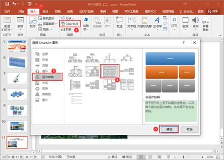 2、新建幻灯片,选择“插入—SmartArt”,打开“选择SmartArt图形”对话框,找到“表层次结构”样式,选择“确定”即可。