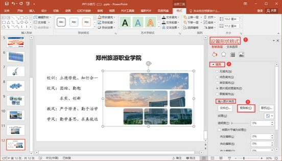 7、选中刚刚组合的图形,打开“设置形状格式”,在“填充”选项中,将“出入图片来自”选择为“剪贴板”,此时,风景图就嵌套进了刚刚修改的形状组合。至此,该幻灯片综合使用SmartArt和pp电子游戏平台网站风景图设计完毕。