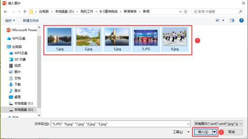 1、打开PPT,选择“插入—图片”命令,选择要插入的5张图片,点击“插入”。