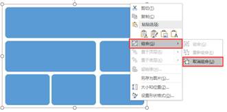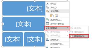 3、选择该SmartArt表,在鼠标右击打开的菜单中,选择“组合—取消组合”,此时便会发现[文本]消失,SmartArt表变成了图形组合。选择该图形组合,在鼠标右击打开的菜单中,再次选择“组合—取消组合”。