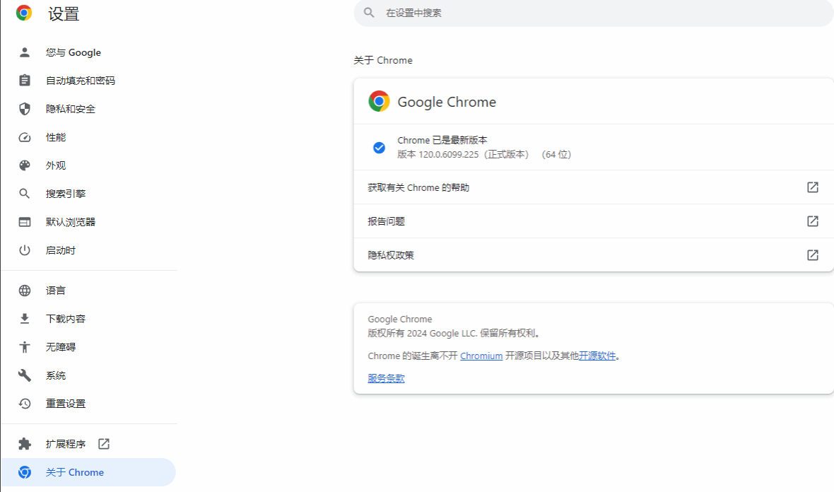 1.查看右上角的“更多”图标,选择设置 -> 关于Google Chrome