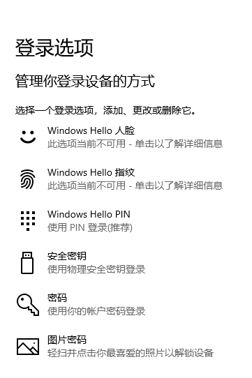 当然除了传统密码,生物识别技术(需要硬件支持)就是又安全又便利的防护方式。比如人脸识别、指纹识别等方式,在设置->账户->登录选项中添加登录方式。