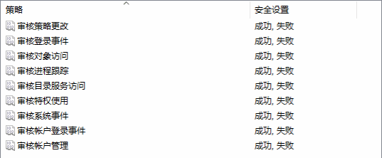 Windows操作系统可以通过组策略启用策略。右击开始菜单,选择运行,输入gpedit.msc,打开本地组策略窗口,选择计算机配置->Windows设置->安全设置->审核策略,在右侧窗口中对所有策略添加审核成功、失败操作记录。