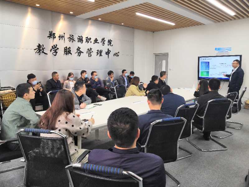 现教科科长采用PPT的形式向参会者介绍了各二级学院对于智慧教室不同的建设模式、建设标准、装修风格及其他要求,参会公司作了详细记录,纷纷表示将会尽快拿出符合学院要求的设计方案供学院参考。