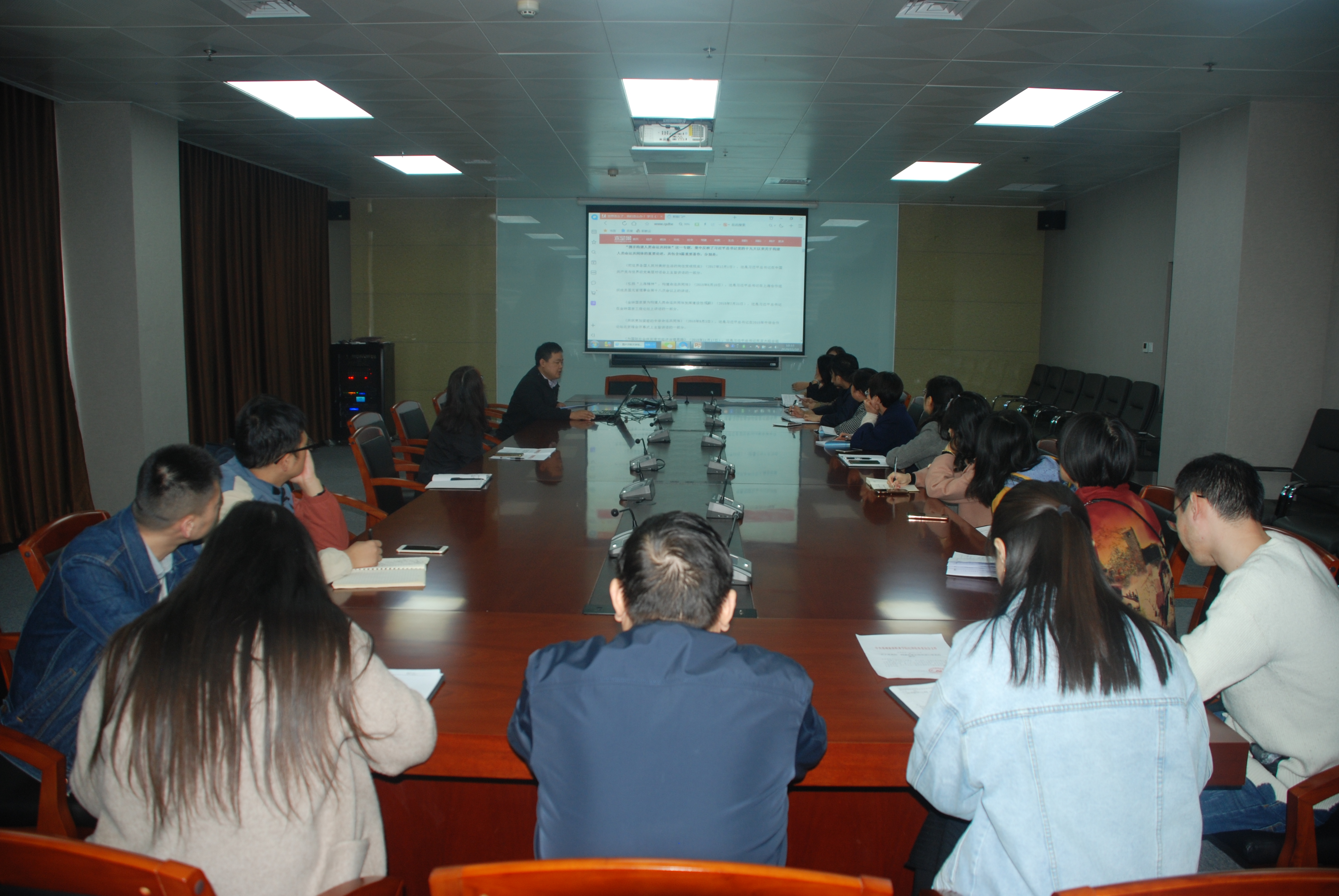 学习的内容是《习近平谈治国理政》第三卷第十七专题—世界怎么了,我们怎么办?携手构建人类命运共同体,学习主讲人是党总支副书记杨瑾。杨副书记从构建人类命运共同体的核心、我们要努力建设什么样的世界、如何把握世界大势和时代潮流等方面向大家介绍了专题的相关内容,使得与会者对于“人类命运共同体”的概念有了一个初步的了解和掌握。