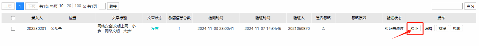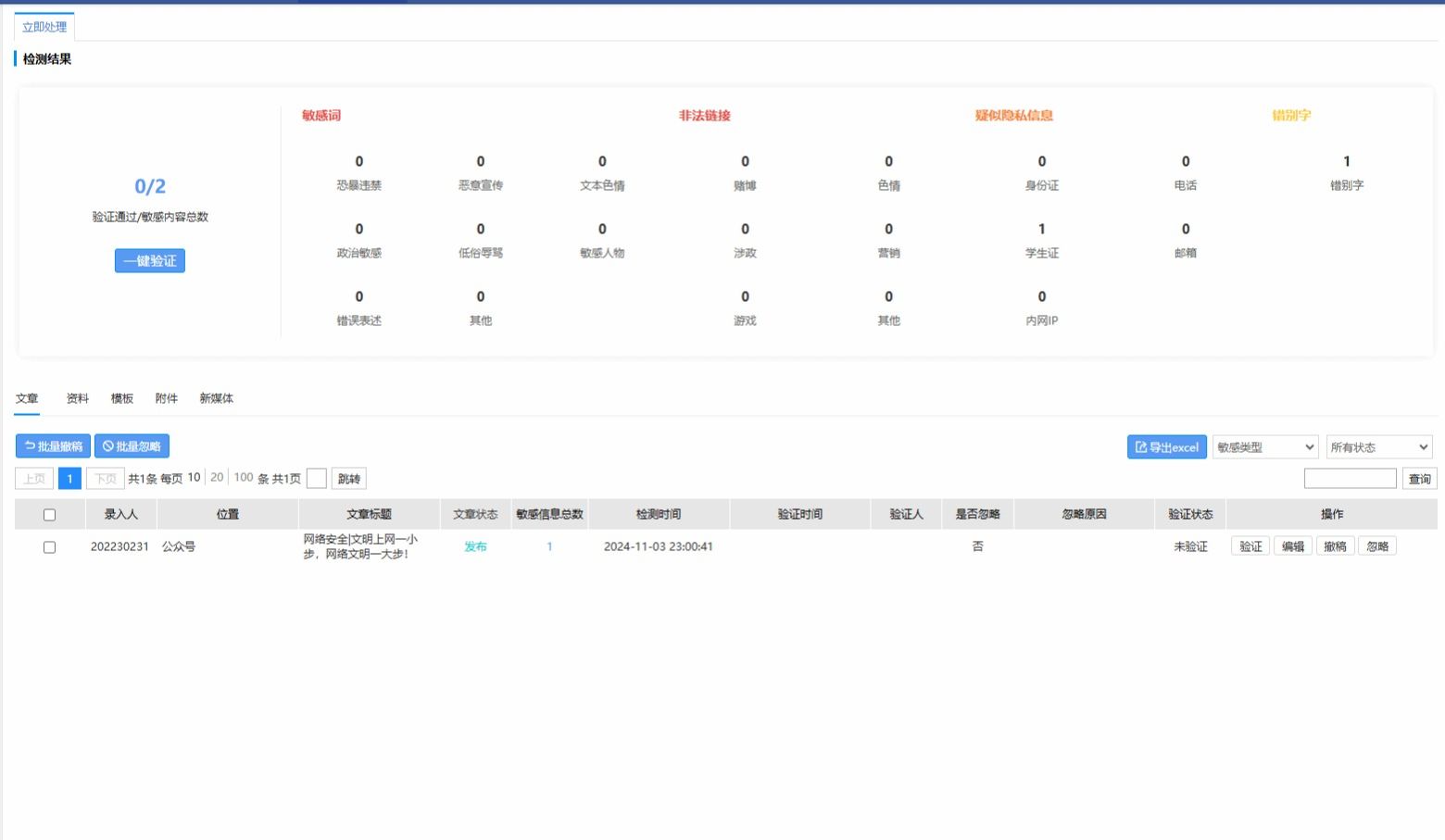 4.列表中显示文章中“敏感信息数”,点击可以看到具体情况。可以点击后面“编辑”按钮根据提示定位敏感信息位置,编辑合规以后点击【验证】按钮,处理完毕。