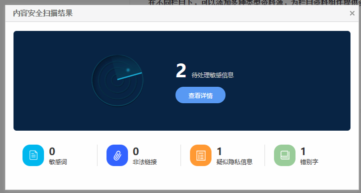 3.点击“查看详情”,系统会列出检测结果的统计信息,和扫描出疑似不符合安全要求的所有文章列表。