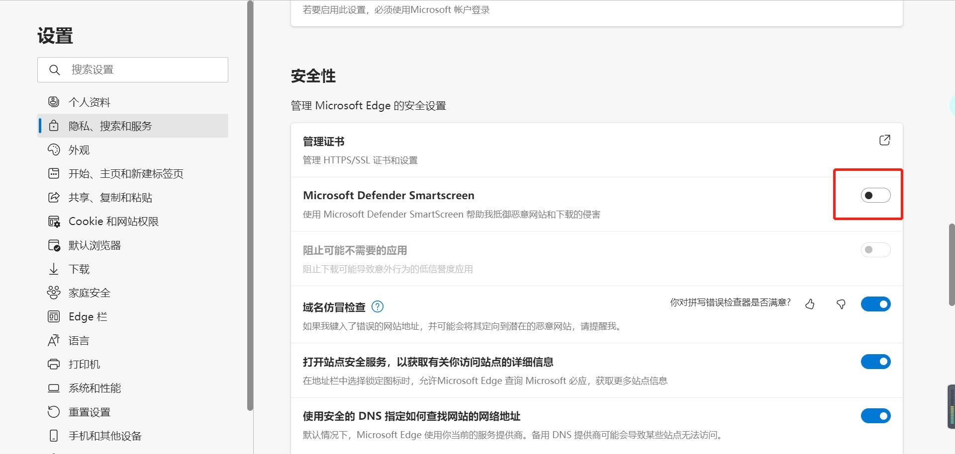 2.若问题仍然存在,请打开浏览器右上角菜单按钮,选择【设置】-【隐私、搜索和服务】,在页面的下部区域找到【安全性】中的【Microsoft Defender Smartscreen】,选择关闭。