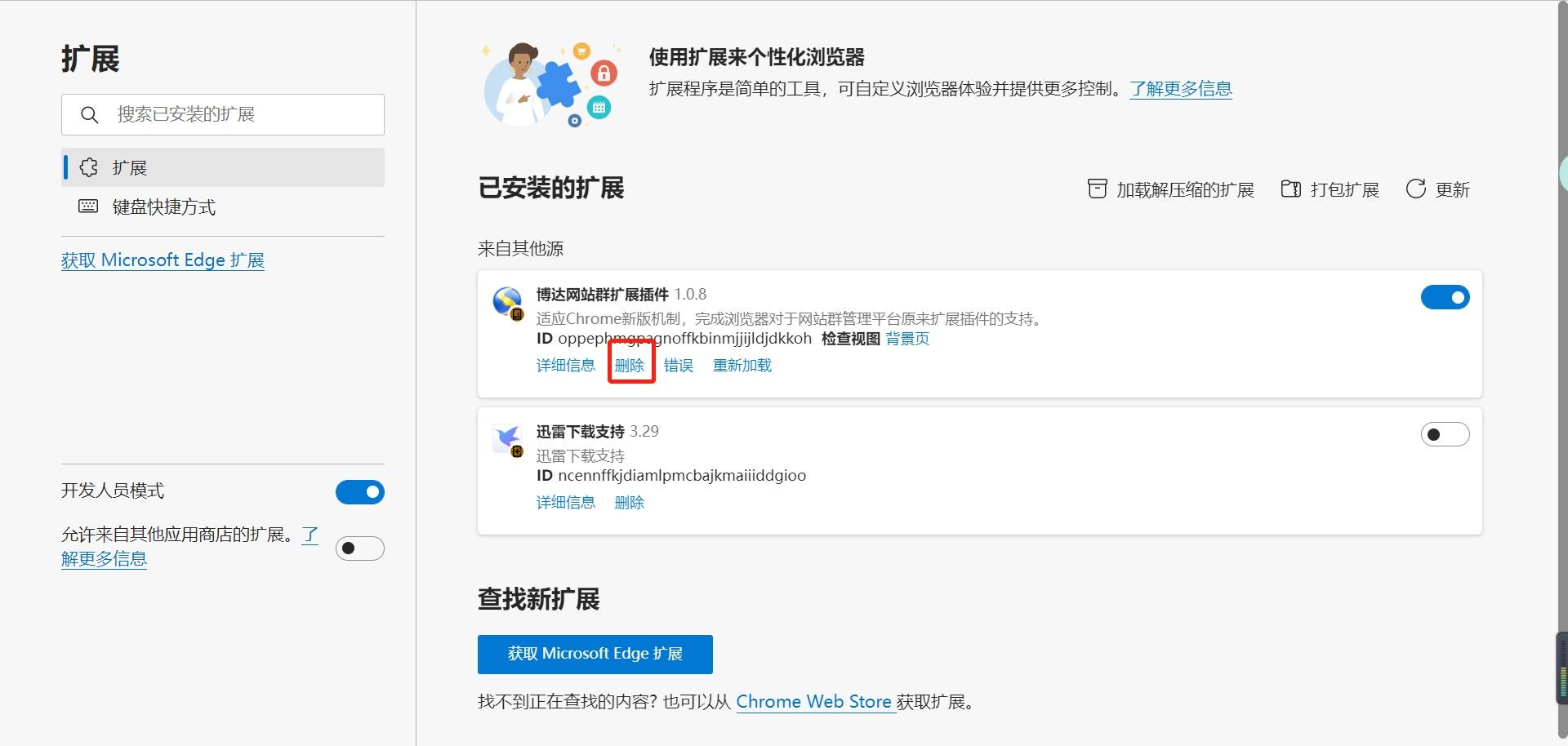 3.删除已配置的博达插件:在浏览器地址栏输入chrome://extensions/(edge浏览器输入edge://extensions/),或通过浏览器右上角菜单按钮,打开【扩展】页面,找到【博达网站群扩展插件】,将其删除。