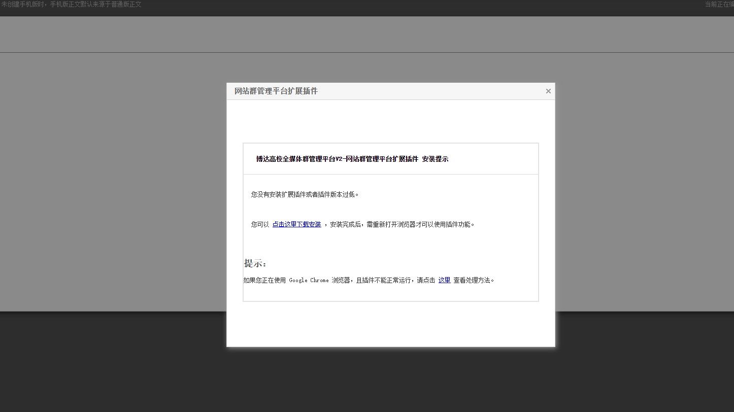 网站群在进行文章编辑时提供了【WORD/WPS导入】和【在线文档导入】功能,需要安装【网站群管理平台扩展插件】,若使用谷歌Chrome浏览器或微软Edge浏览器,则可能出现插件不能正常运行的情况(如下图)。若出现此类情况,可以按照下面的方法来进行设置,解决此类问题。