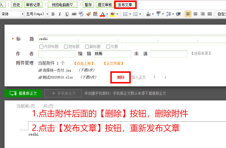3.确认编辑页面中附件管理一栏现有的附件内容,无误后,点击【发布文章】,重新发布文章。