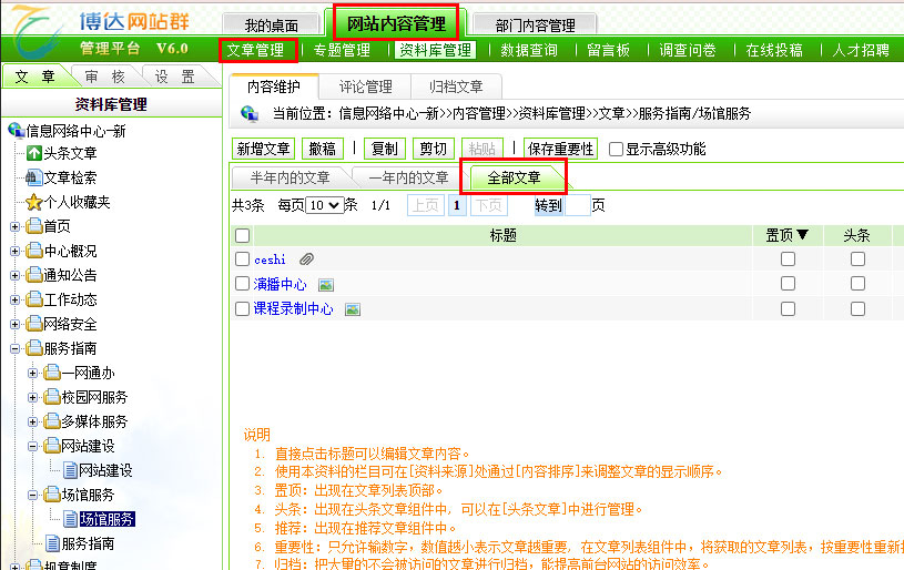 1.进入站群【网站内容管理】模式,选择【文章管理】或【资料库管理】功能,根据文章存在的栏目,找到对应的文章标题。注意,如果文章发布的较早,需要点击【全部文章】,可以根据关键字来进行查找。