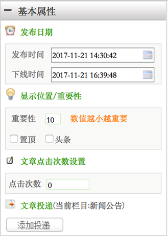 (2)下线时间:可以为文章设置下线时间,到规定时间文章将不在前台显示。