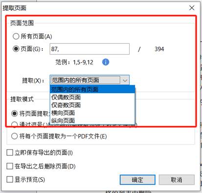 我们可以选择“范围内的所有页面”、“仅偶数页面”、“仅奇数页面”、“横向页面”或“纵向页面”来提取指定范围内的相应页面。