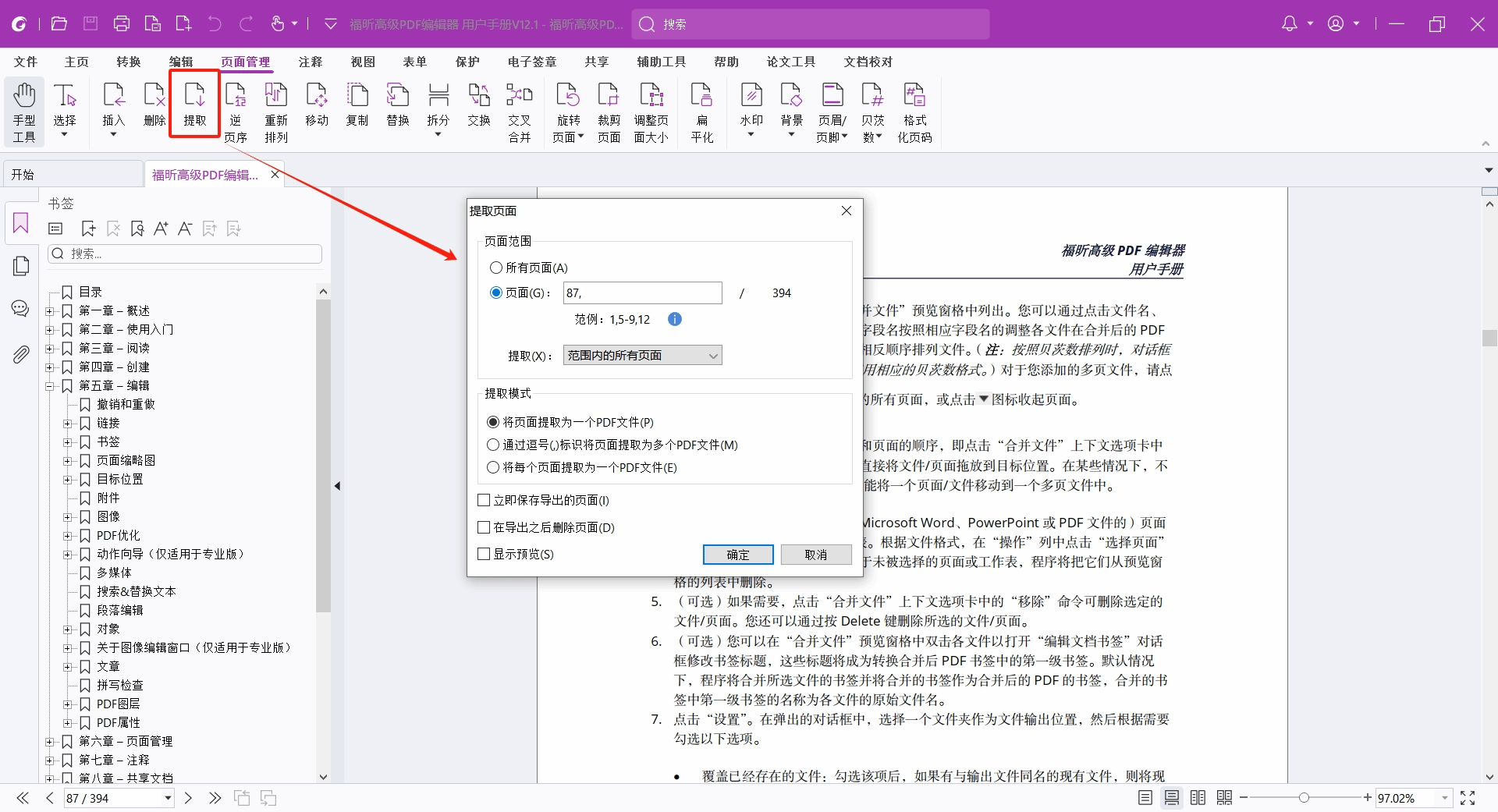我们利用福昕高级PDF编辑器打开一份需要提取的文档,点击“页面管理”>“提取”,在弹出的提取页面对话框中,选择要提取的页面范围以及提取模式等设置。
