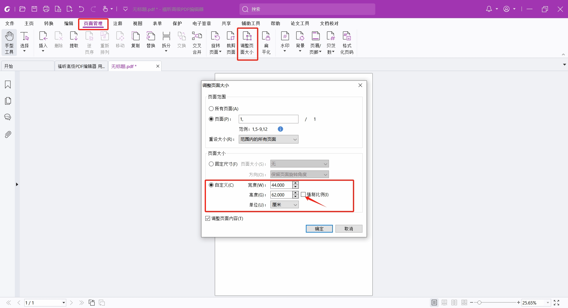 首先我们创建一个空白页,点击“页面管理”>“调整大小”,选择自定义尺寸。比如我们这边要制作一张海报,我们填入尺寸44*62cm,点击确定即可修改尺寸。