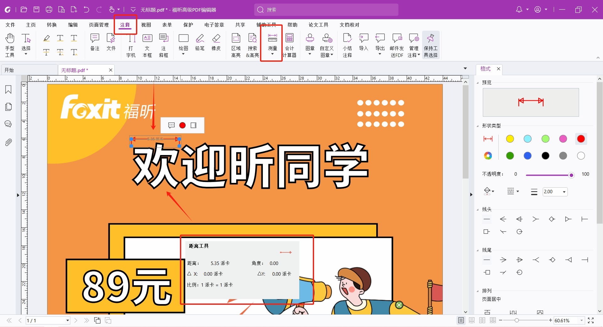 如果要预估展架上可以放多少内容,可以提前在线下量好尺寸,以及最远距离应该设置的字体大小(如想在2m远看清文字,则文字最小字宽需要5cm),然后创建好该尺寸的空白页,填入文字后,点击“注释”>“测量”,测量好文字的大小即可。