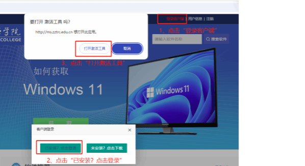 (3)在网页上点击打开激活工具(首次登录时需输入个人统一身份认证账号密码)