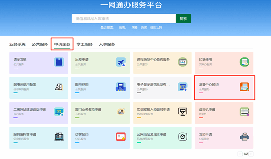 一、进入一网通办服务平台,在“申请服务”中选择“演播中心预约”。