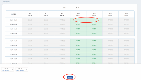 二、在预约界面中,显示绿色的时间段为可预约时间段,多天多时间段可以一次选择完毕后,一并提交。