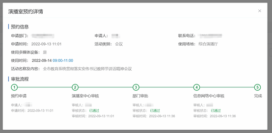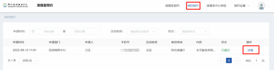 四、返回预约主页,在“我的预约”中点击“详情”可查看申请审批进度。注意:申请人请及时关注申请审批进度,只有在审批流程完成后,可在预约时间内正常使用场地。如果申请没通过,可与审批流程节点显示的相应负责人取得联系,询问审批情况。