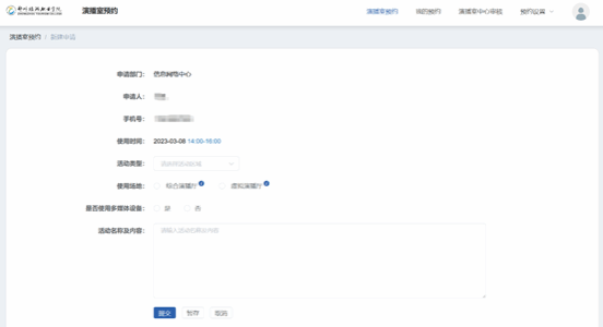 三、选择好预约时间段后,点击“去预约”按钮,新建预约申请。在新建申请中,选择活动类型,填写活动内容名称,比如会议名称、活动内容等,点击提交完成申请。注意:请至少提前24小时预约。
