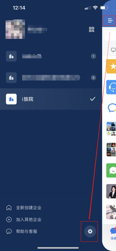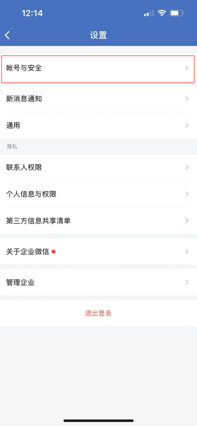 1.在企业微信APP首页右滑,或点击页面左上角【三横线】,进入【我的】界面,点击右下角齿轮按钮,进入设置页面。点击【账号与安全】,打开页面。
