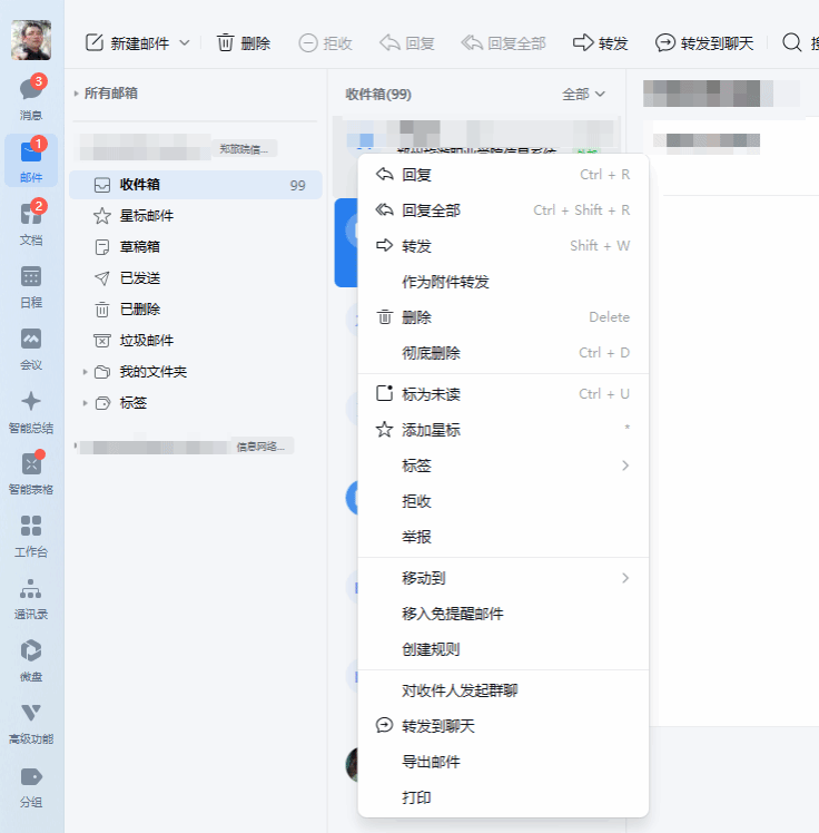 处理邮件:右键点击菜单中的「回复」「转发」,可快速回复或转发邮件;也可点击「标记」,选择「已读」「星标」「删除」等操作;