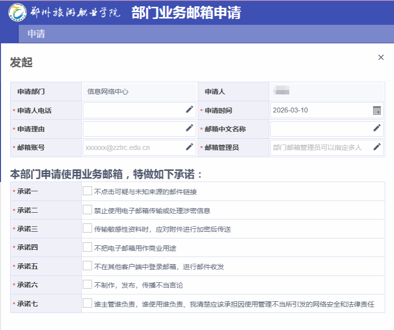 申请时需填写邮箱中文名称,邮箱账号,邮箱管理员,并按要求承诺安全使用公共邮箱,填写完成后提交审核。