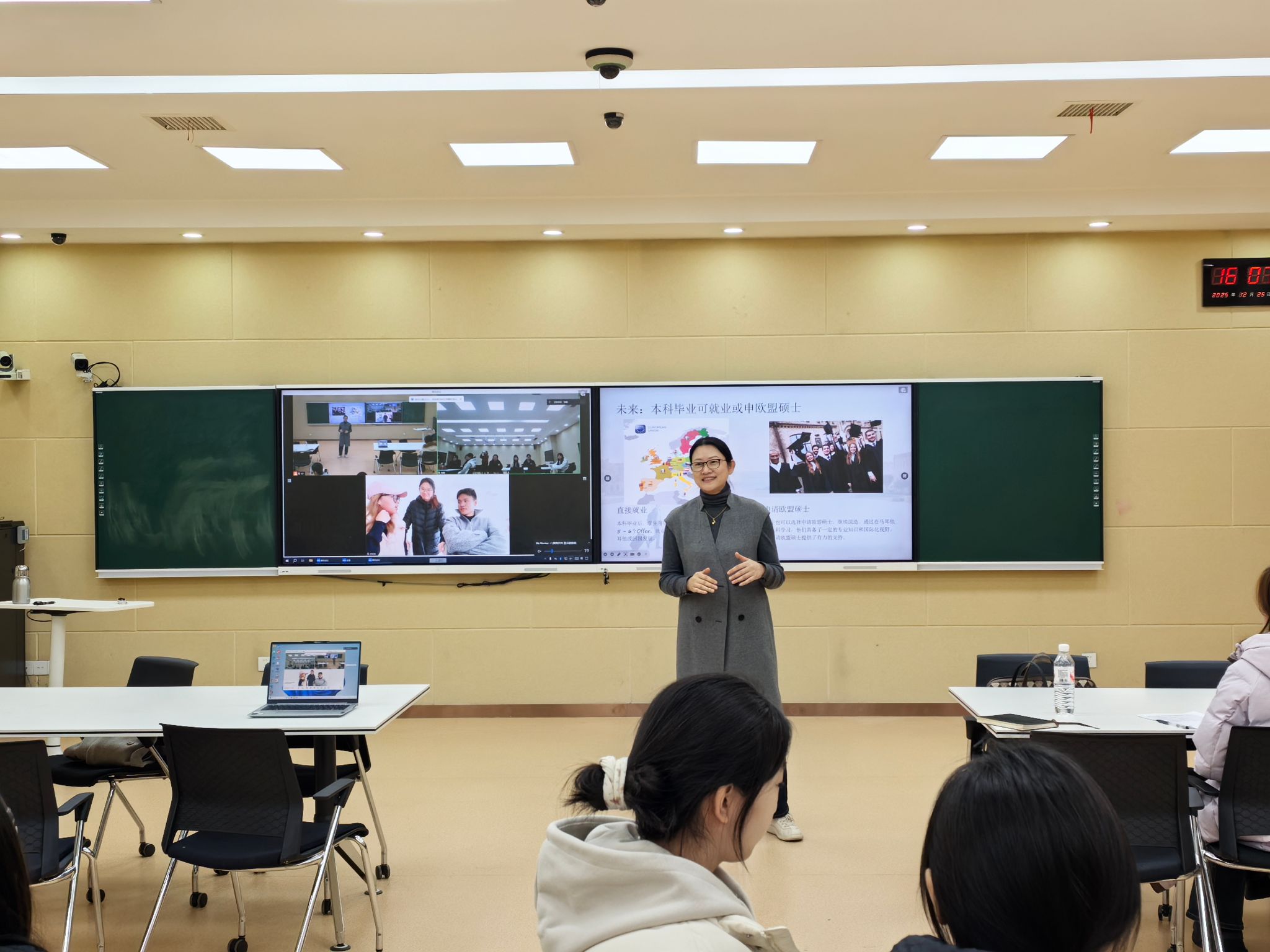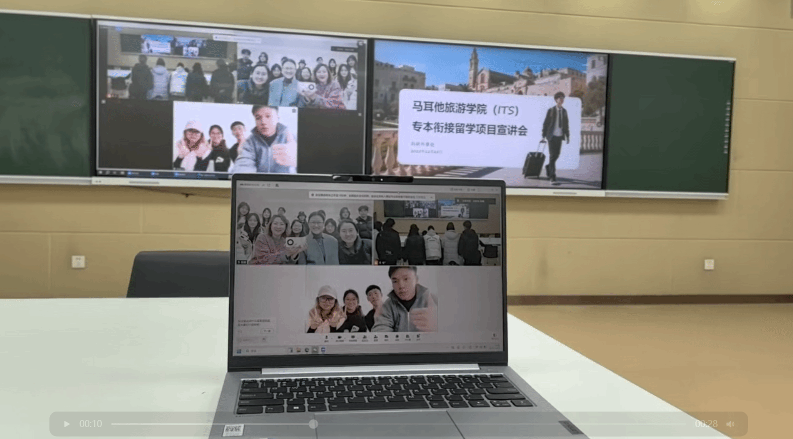 说明会的第一环节是与第一届赴马学长学姐的在线连线。四位学长学姐结合自身在马耳他的学习生活经历,分享了课堂学习收获、独立生活经验以及当地的风土人情。他们详细解答了学弟学妹们关于课程难度、语言适应、住宿条件、饮食习惯等方面的疑问,并鼓励大家把握国际化深造机会,积极报名。这场跨越山海的实时交流,极大地拉近了学生们与项目的心理距离,增强了项目的可信度与吸引力。