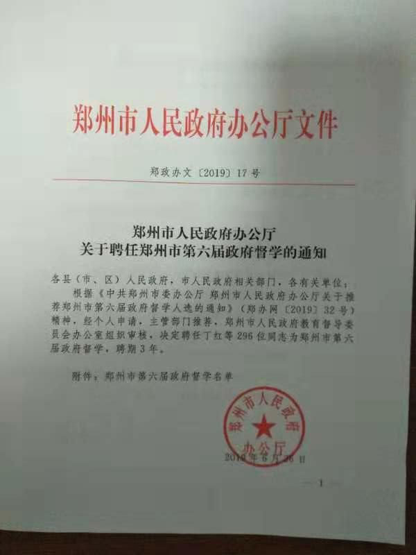 据了解, 聘任政府督学旨在加强郑州市教育督导队伍建设和教育督导工作,促进教育督导事业快速发展。第六届政府督学共聘任296位。由学校推荐,郑州市人民政府教育督导委员会组织评审,涵盖全市各教育类型。督学受聘期间按照市政府教育督导室的部署参加全市教育督导工作。