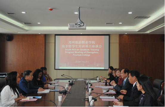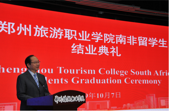 在南非留学生结业典礼上,文院长向南非留学生顺利完成学业表示祝贺,向南非中国文化和国际教育交流中心,南非高教部、文化艺术旅游体育培训署,河南省、郑州市各级政府及教育和文化旅游主管部门,各校企合作单位的大力支持表示感谢。最后,他对南非留学生提出几点希望,一是希望南非留学生做好中南文化交流的使者;二是做好祖国文化和旅游建设的行者;三是做好人生赛道上的赢者,希望南非同学将来以校友的身份回中国探望和交流。MPYE女士在讲话中要求南非学生心怀感恩,把在中国所学用到南非未来旅游业的发展上,并做好中国与南非旅游业的差异化区别,做好中非友谊的传送者。南非班班主任代表张媛老师回顾了留学生学习、实习过程中的付出与收获,并给予他们美好的祝福。南非留学生代表周小月、祖玛进行发言,他们对南非高教部、河南省教育厅表示感谢,并表示将把学到的专业知识运用到本国旅游事业的发展中,努力成为中南友谊的使者。随后,河南省教育厅对外合作处王东辰颁发河南省外国留学生奖学金证书,文广轩院长为南非留学生颁发结业证书。