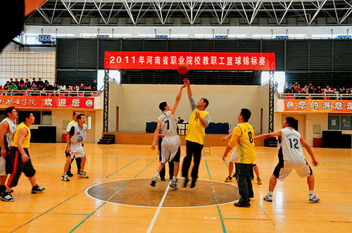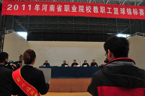 开幕式由河南省学生体育总会中专体育协会秘书长刘小明主持。我院党委副书记、院长陈锡畴首先发表了热情洋溢的欢迎词,希望通过比赛加强与兄弟院校之间的交流与合作,共同为我省职业教育的发展努力。省教育厅艺体卫处副处长聂世忠在开幕式上讲话,他强调,举办本次比赛的目的在于推动篮球运动在职业院校的普及和发展,加强我省职业院校校际间交流与合作,促进我省职业教育的发展。他在讲话中对各参赛代表队提出了希望,并预祝比赛举办成功。河南省轻工业学校校长樊安新宣布2011年河南省职业院校教职工篮球锦标赛比赛开始。在河南省轻工业学校篮球宝贝的啦啦操精彩表演之后,首场比赛在河南省财经学校和郑州市卫生学校两支代表队之间展开。