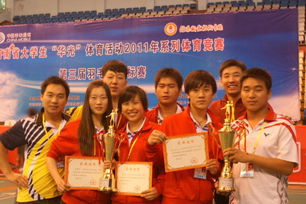 9月28日,河南省大学生“华光”体育活动2011年系列体育竞赛暨第三届羽毛球锦标赛在信阳职业技术学院落下帷幕。pp电子羽毛球代表队在此次比赛中,获得河南省大学生专科甲组女子单打第二名、女子双打第二名、女子单打第八名、男子单打第八名、男子团体第五名的优异成绩,1名教练员获得“优秀教练员”、2名运动员获得“优秀运动员”光荣称号。