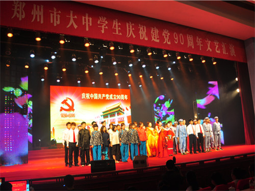 为迎接中国共产党建党90周年,中共郑州市委组织部、中共郑州市委宣传部、共青团郑州市委、郑州市教育局联合主办“党旗引领成长 红色点亮青春”——郑州市大中学生庆祝建党90周年文艺汇演,于2011年6月13日在郑州市青少年宫举行。