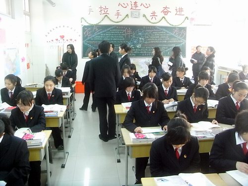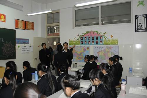 领导们在参观中看到,各个班级被装扮得整洁而充满文化气息,地面纤尘不染,卫生工具整体地摆放在墙角,各具特色的口号挂在墙上,激励着每一个人。同学们各式各样的笑脸组成的照片墙、美好祝愿组成的祝愿池、可爱而亲昵的绰号编成的“绰号集”,还有外国文化介绍等等把原本空白的墙壁装饰得丰富多彩。各班同学也都表现出了良好的精神风貌。他们穿着整齐地校服,朗朗书声给回荡在教室中 ;还有的大声唱起了自己的班歌欢迎领导们的到来。