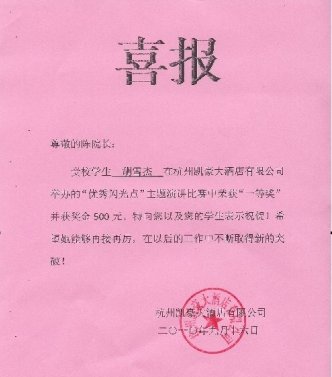 在日前刚刚结束的杭州凯豪大酒店“优秀闪光点”主题演讲比赛中,我院学生胡雪杰以一篇题为《凯豪的感动瞬间》的演讲,讲述了我院13名学生在该酒店实习的50多天里面的点滴感受,讲述了同学们在凯豪酒店的成长历程,最终获得比赛的一等奖,凯豪酒店还特地发来喜报,向全院师生报喜。