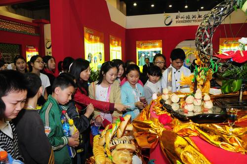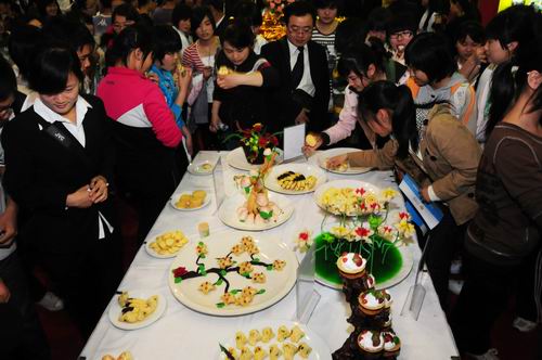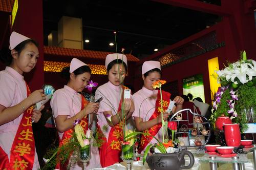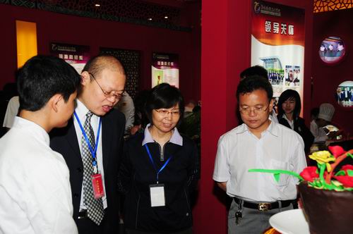 此次我院参加展览的展厅面积324㎡,内设招生就业办、酒店管理系、旅游商贸系、旅游管理系、旅游外语系和机电系(合)五个展区,展示我院办学理念、办学特色和办学成果,学生现场技能和作品展示主要有茶艺、调酒、插花、刀工、雕刻、冷拼、面点等。展厅以突出“传统、旅游、职教”三大特色为理念,采用中式四合院建筑风格,以中国红为主色调,大气、庄重、喜庆。正门双狮雄卧,尊贵、威严,侧门抱鼓石矗立,丰硕、兴旺。同时,学院展区还通过多媒体展示、学生才艺展示和现场表演等多种形式展示了我院的办学成果。学院领导和各系负责人参加了大会并向广大市民提供面对面的咨询服务。
