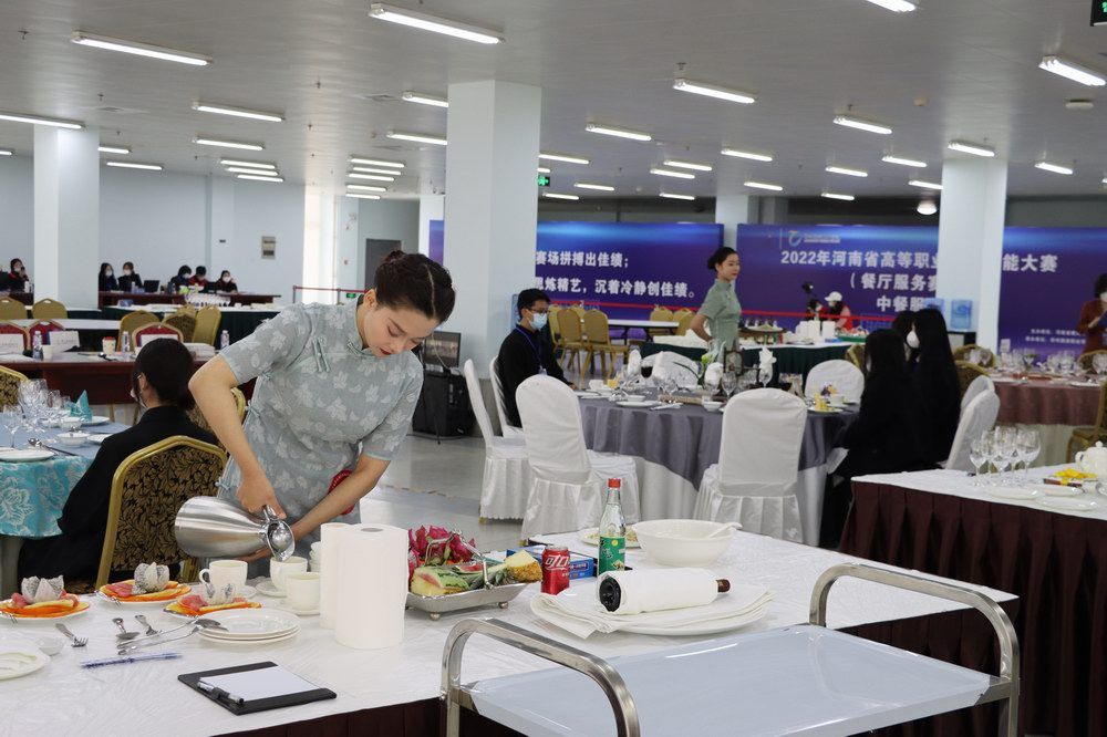 3月18日上午,2022年河南省高等职业教育技能大赛餐厅服务赛项在pp电子游戏平台网站拉开帷幕,来自河南省内31个院校68支队伍的136名选手将在2天半的赛程中展开角逐。