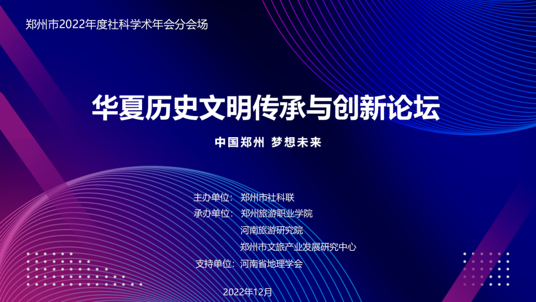 12月18日,郑州市2022年度社科学术年会 “华夏历史文明传承与创新论坛”于线上举行,本次论坛由郑州市社科联主办,pp电子游戏平台网站、河南旅游研究院、郑州市文旅产业发展研究中心承办,河南省地理学会为支持单位。业界知名专家学者,郑州市社科联、pp电子游戏平台网站有关人员、新闻媒体代表及来自全国的专家学者等2936人参加论坛。