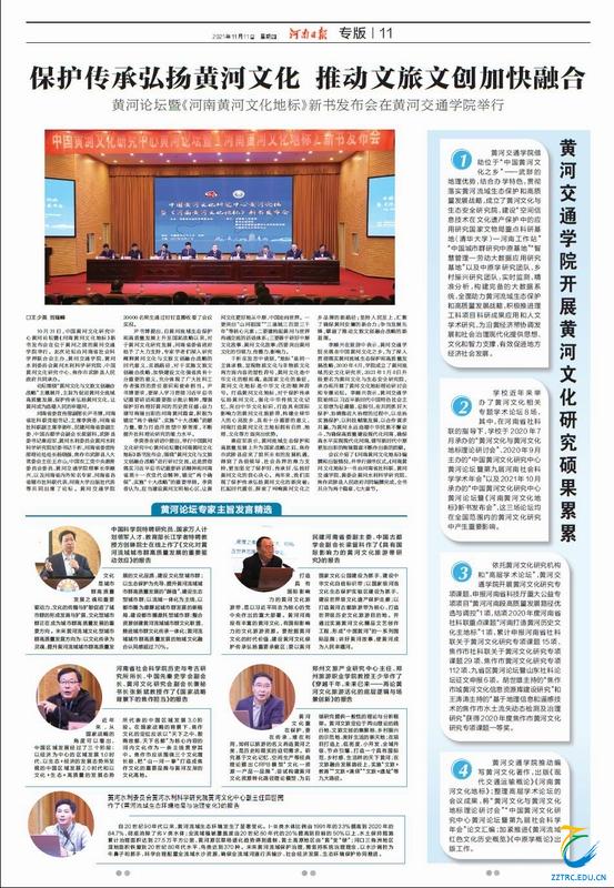 10月30日下午,中国黄河文化研究中心黄河论坛暨《河南黄河文化地标》新书发布会在位于黄河之滨的黄河交通学院隆重举行。pp电子河南旅游研究院王少华院长受邀参与了此次论坛,并作《穿越千年,未来已来——再论黄河文化旅游活化的底层逻辑与场景创新》的报告,被河南日报官方报道。