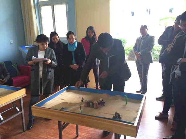 活动在生理心理健康教育中心张爱梅老师的指导下有序进行。首先,学生处10位教师组成一个参与团体,通过充满童趣的“猜黑白”、“剪刀石头布”等游戏排列活动顺序。接着,进入摆放环节,参与者用沙具将自己内心所想一一呈现在沙盘中。大家在认真投入、自由创造的同时又能考虑到整体布局,最终呈现出大家满意的沙盘场景。摆放环节结束后,张爱梅老师引导参与者借助自己摆放的沙具进行内心活动描述,在陈述与交流中,教师们通过分享沙具的故事与感受,讲述着自己在游戏中和他人之间的冲突与融合;从最初的不接纳到接纳,从不舒服到释然,最终形成和谐、美好的局面。最后,宋亚卿副处长、朱世杰副处长分别就此活动进行了点评。