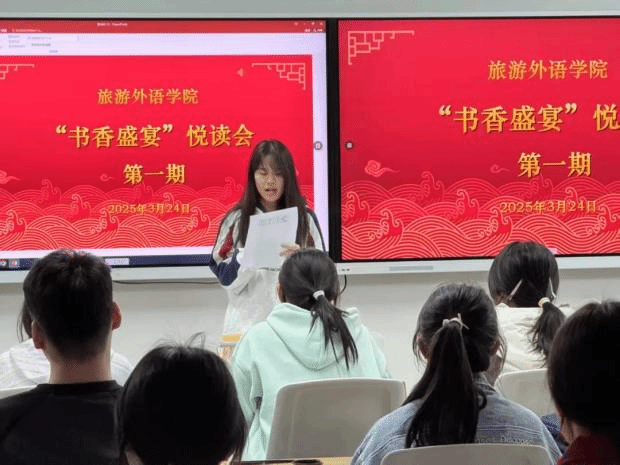3月31日,旅游管理学院在5b209开展“品传统文化,悟书香魅力”悦读分享会。各班代表齐聚一堂,依次上台推荐班级推选的书籍。同学们介绍了作者背景、分享选择该书的初衷、赏析书中经典语句、畅谈阅读后的感悟,现场气氛热烈,大家沉浸在浓厚的书香氛围中,感受传统文化的博大精深。