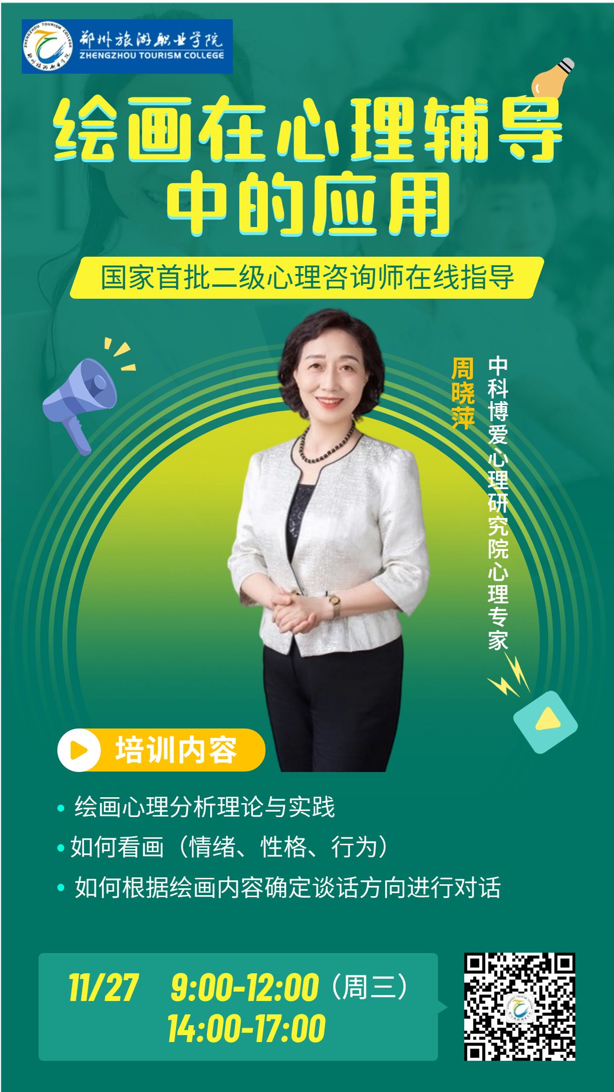 有意向参加此次培训的老师,可提交报名信息(姓名+学院)至二级学院心理负责老师处(二级学院心理负责老师名单如下),报名时间截止至11月27日上午10:00。