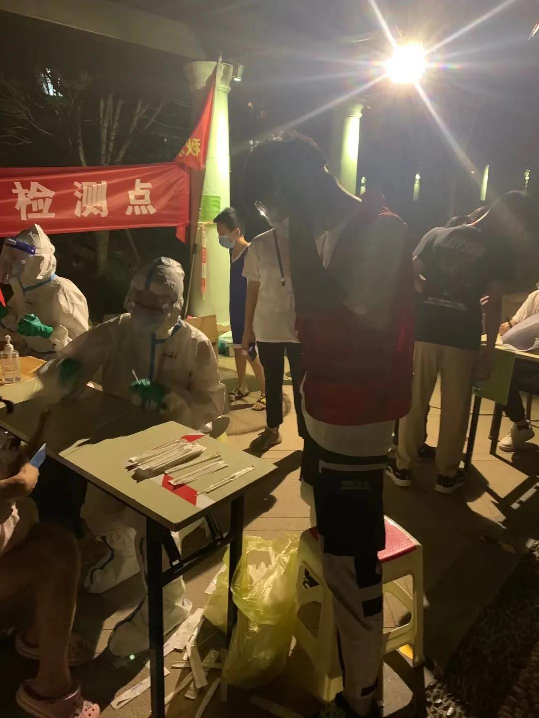 8月1日,20级国际邮轮1班郭建钊下午在做完小区的核算检测后看到医生和志愿者们忙碌的身影便决定留在现场贡献出自己的一份力。他报名成为了一名志愿者,同其他志愿者及社区人员一起组织社区居民有序扫码参加检测维持现场秩序并为社区居民提供帮助。时至傍晚接替其他志愿者负责医务人员的核酸检测辅助工作,并对医务用品进行准备和整理,帮助医务人员分担工作。六个小时的志愿服务,当检测结束的那一刻摘下手套才发现手套里已经充满汗水