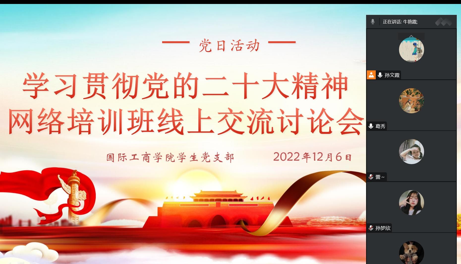 党的二十大是在全党全国各族人民迈上全面建设社会主义现代化国家新征程、向着第二个百年奋斗目标进军的关键时刻召开的一次十分重要的大会。11月30日-12月2日,国际工商学院学生党支部全体成员参加网络培训班学习贯彻党的二十大精神。