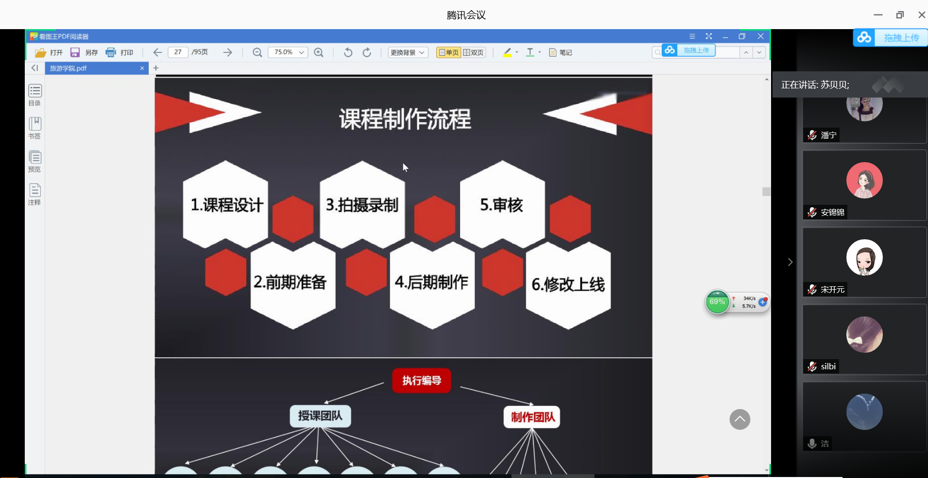 7月4日下午5点,信息工程学院计算机基础教研室运用腾讯会议召开了《计算机应用基础》精品在线课程建设的网络推进会议,出席会议的有潘宁院长、张洁主任以及各课程建设团队老师。会议邀请了课程建设顾问苏贝贝老师,会上苏贝贝老师详细介绍了课程建设的具体流程,并展示了相关课程的建设成果视频,使大家对课程建设的下一步工作有了初步认识。与会老师积极探讨交流,理清了工作思路以及后期课程建设的关键点。