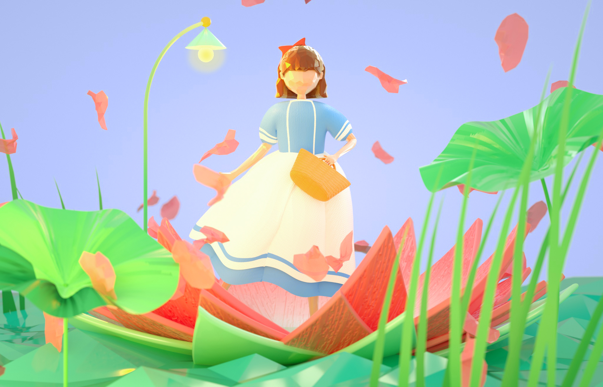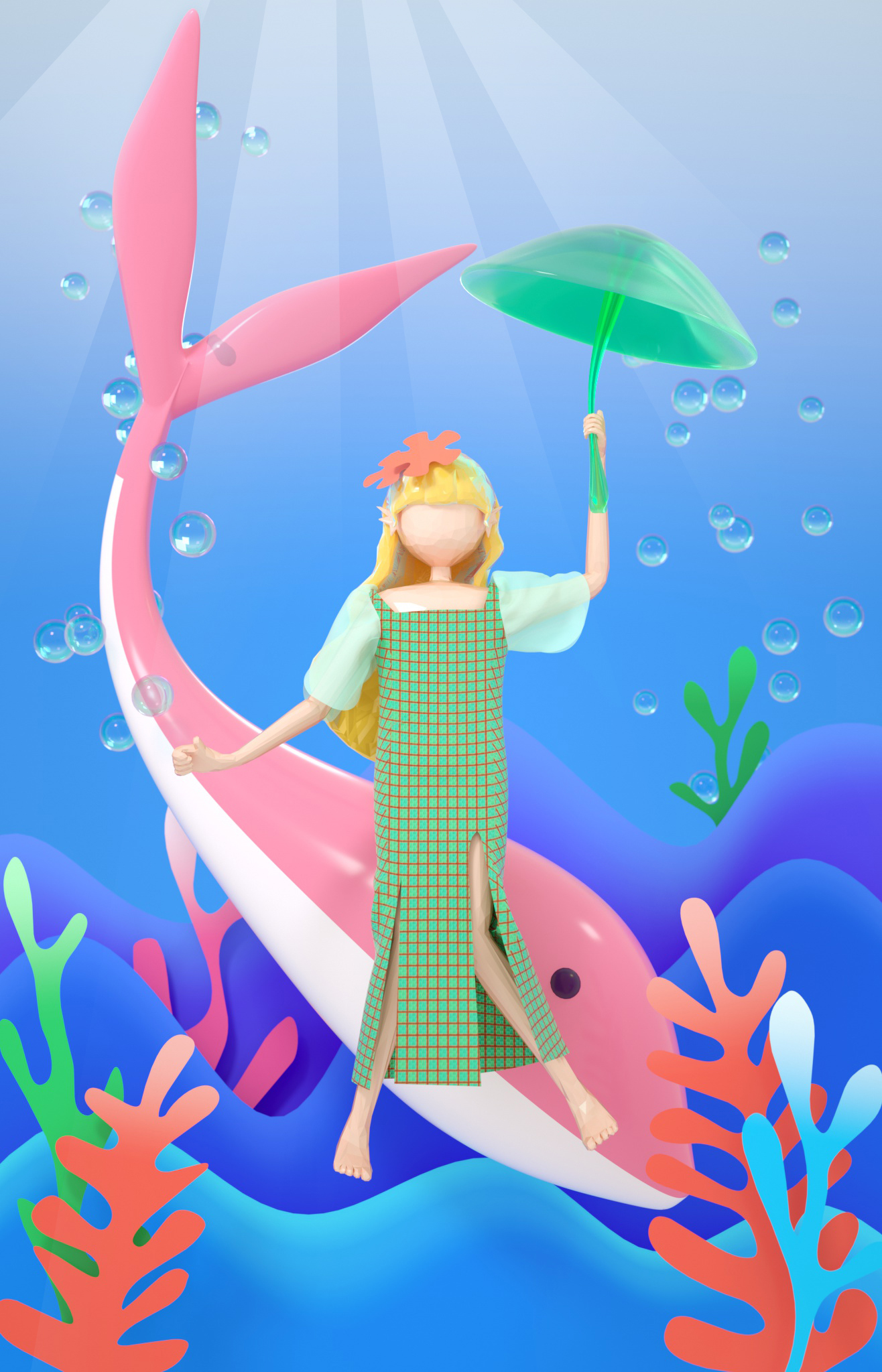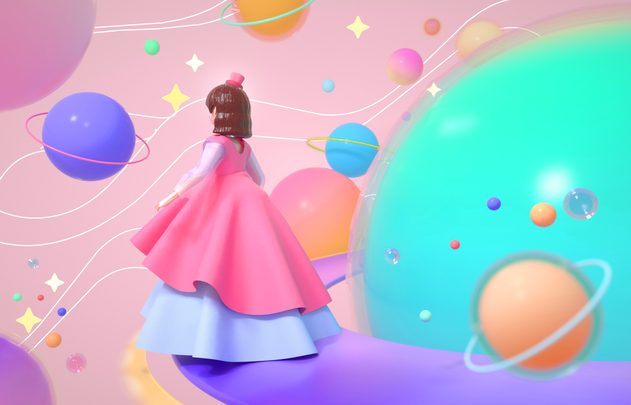 设计说明:这一组三维插画的设计灵感来源于一次奇妙的梦境。梦中的场景十分贴近生活,明明是常常发生的场景,却又显得有些陌生。因为近期疫情的影响,人们不得不待在家里避免外出,我们和外界的事物隔开了一段距离,我也同样如此,每天都是过着枯燥的生活。这场梦境让我不禁想起了所期盼的那些美好。她站在自己的星星上眺望浩瀚无垠的宇宙,思考着渺小的自己存在于此间的意义。她伴着飘舞的花瓣,脚尖轻点在花间旋转,坐在橘子摩天轮上呼喊。白色的奶油蛋糕做的小床和装满糖果的罐子装点着她的生活。又是一只粉色的鲸鱼领着她潜入海底,偶然发现一盏古老的琉璃杯成了她自己的秘密基地。女孩站在另一块浮冰上,手中的气球递给正望着她的企鹅。又穿梭到竹林,拥抱住软绵绵的大熊猫,彼此在欢笑。
